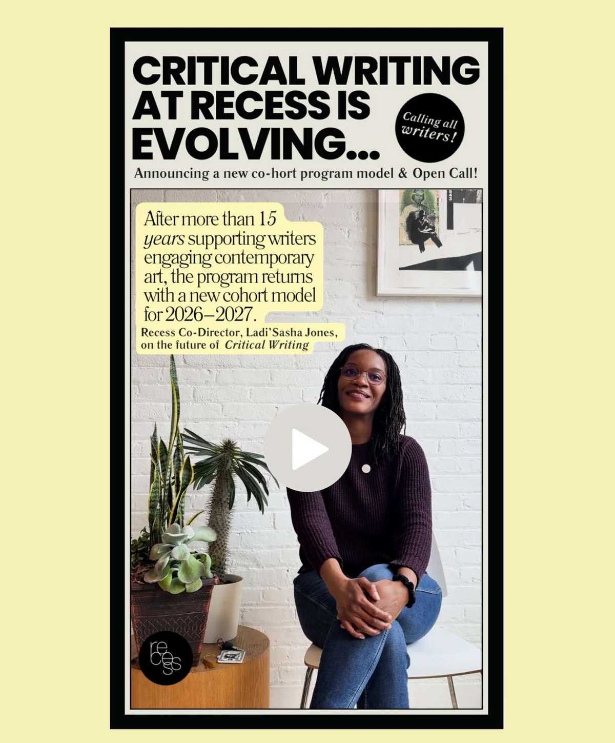 Recess invites applications for the 2026–2027 Critical Writing cohort.