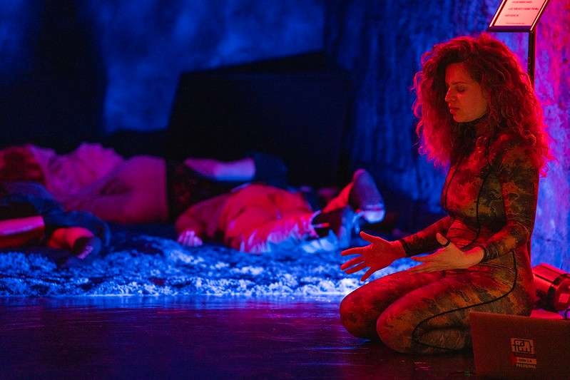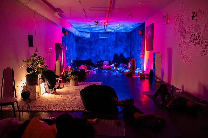 It follows that I was delighted to engage with Miriam Simun’s INSTITUTE FOR TRANSHUMANIST CEPHALOPOD EVOLUTION, an interdisciplinary installation- exhibition, workshop series, and month-long residency at Recess in Brooklyn. Upon entering the space, I hunkered down and sat on a floor covered with a soft, tufted fabric that also covered the ceiling and adjacent walls. The fabric’s dark blue color infused the cocoon-like space with a dreamy atmosphere. The gentle soundtrack of mellow piano playing coupled with natural watery sounds added to my already peaceful state. Over the next twenty-five minutes I followed Simun’s video YOUR URGE TO BREATHE IS A LIE (2019), presented on a large flat screen positioned directly in front of me. What caught my attention was the movement of the different performers—individual cuttlefish, squid, and octopuses (marine animals known as cephalopods), as well as a corps of contemporary dancers. The motion of their bodies had a similarity. It made no difference whether what I saw was arms, hands or feet, or whether the movement was carried out underwater, in a studio, or in the open air. Before experiencing the INSTITUTE FOR TRANSHUMANIST CEPHALOPOD EVOLUTION, I had never given much thought to cephalopods, believed to be the among the most ancient and adaptable creatures on Earth; nor had I ever considered what these entities might conjure up for human beings. In my encounter with Simun, I discovered someone whose work not only bridges art, science, and human behavior, but addresses our need to operate as a community in a world where nature often appears to be debased. The artist’s insightful work evolved out of her graduate studies at MIT, and out of her interest in climate change and concern for the future. Studying with MIT scientists, she gravitated towards cephalopods, with their “distributed intelligence.” She thought that maybe the future of the human had to do with two or more humans (and maybe non-humans) coming together to become, even briefly, “a single organism.” She was trying to figure out how to “train” this ability, and thought of moments where this happens—in music improvisation, during sex, and other times where a kind of “third intelligence” emerges in real time out of a kind of a brain- body meld. Having experienced such moments on the dancefloor as a raver during college, it made sense when her friend suggested she try contact improvisation, a dance form out of which a kind of group intelligence emerges. She realized that contact dance, originated by Steve Paxton in 1972, would be a useful tool for her.