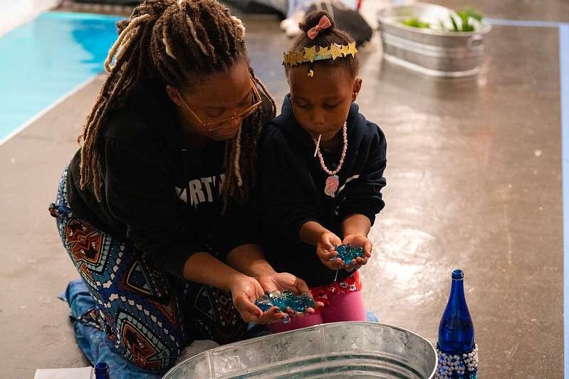 Fully immersive in nature, the installation takes shape equally from the artists’ work and contributions from local students, community members, and audiences who shared stories, contributed to a community altar, and participated in workshops and conversations. Each of the artists facilitated workshops that lent themselves to the development of the installation, including workshops on dance and movement with Ross, candy mosaics crafting with Murray, and water-inspired mantra-creation with Diata.