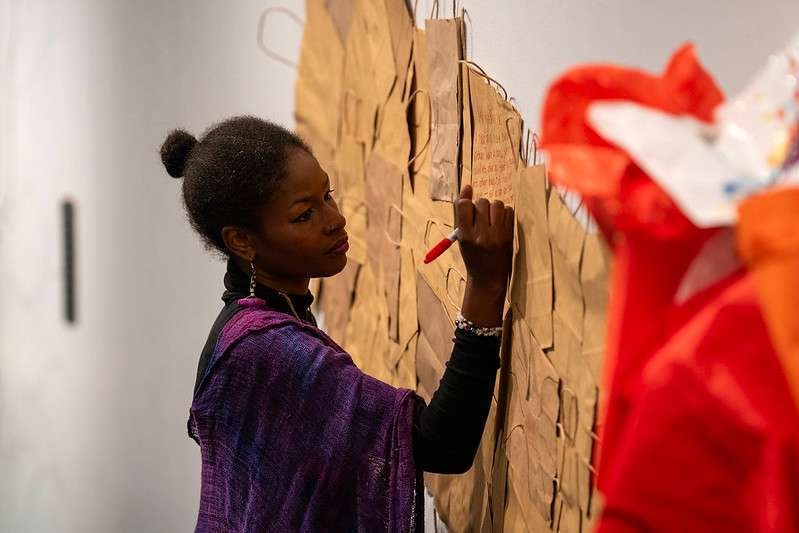As I walked into the first portal of the installation, I was greeted by a regal and welcoming figure, performed by Asma Feyijinmi, adorned in a voluminous garment made of bags. I marveled at her and the echo on the wall behind her, which was also decorated with an array of bags of the brown paper variety, all etched with handwritten notes and sketches. The figure removed her outer garment and began a series of gathering motions, transferring different odd and ends and “stuff” into her bags, before pausing to pose the question, “What’s the stuff that I’m stuffing into my bag?”